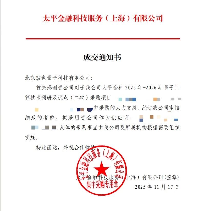 2025年11月,中国太平丨太平云采官网发布太平金科2025年-2026年量子计算技术预研及试点(二次)采购项目成交公告。公告显示,北京玻色量子科技有限公司成功中标太平金科2025年-2026年量子计算技术预研及试点服务。