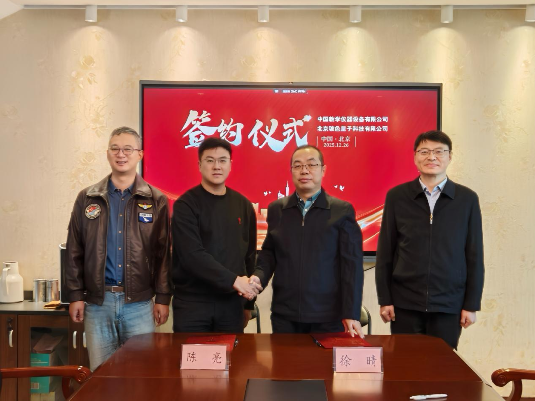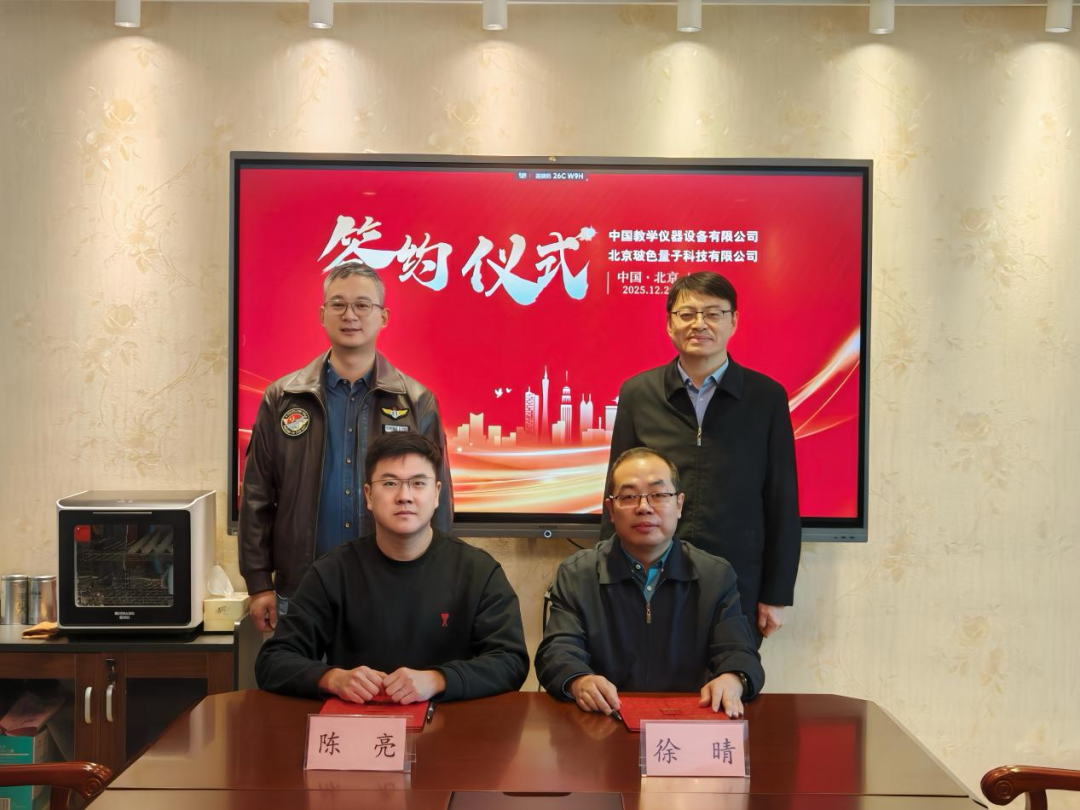 2025年12月26日,北京玻色量子科技有限公司(以下简称“玻色量子”)与中国教学仪器设备有限公司(以下简称“中教仪”)在“量子计算+教育”领域达成合作,共同致力于将国产专用量子计算的顶尖力量打造为注入高校人才培养与科研创新的源头活水,为“量子计算+教育”生态建设构筑坚实的人才基座。玻色量子副总裁陈亮与中教仪副总经理徐晴在中教仪西单办公区正式签署合作协议,玻色量子创始人&COO马寅与中教仪总经理黄刚见证签约。